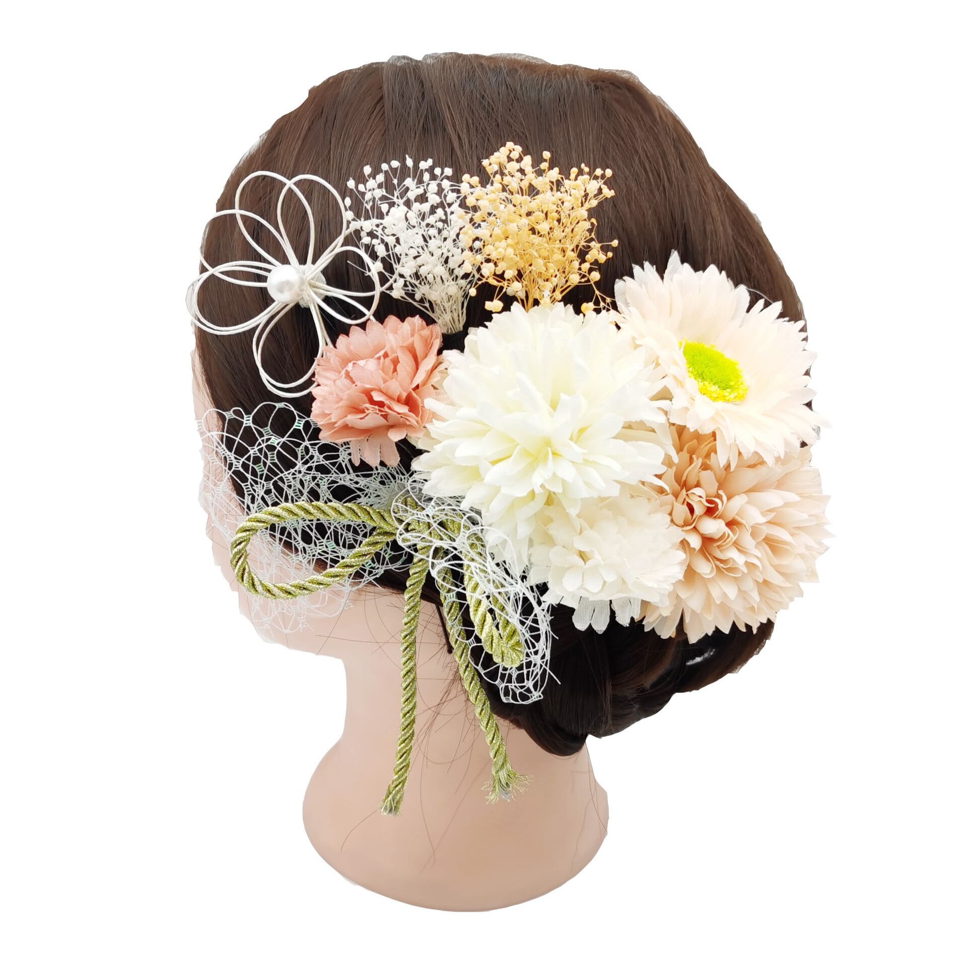 ヘアピン型 髪飾り 和風 縄飾り 結婚式 パーティ グリーン 白 自然 ナチュラル ピンク ベージュ オレンジ 造花 上品 着物 ファッション 着物に合う 大正ロマン レトロ かわいい セクシー 結婚式 2次回 お見合い 和装 衣装 ダンス衣装 decoration japanese traditional hair gourgeous kimono recommendation japan YaBoW