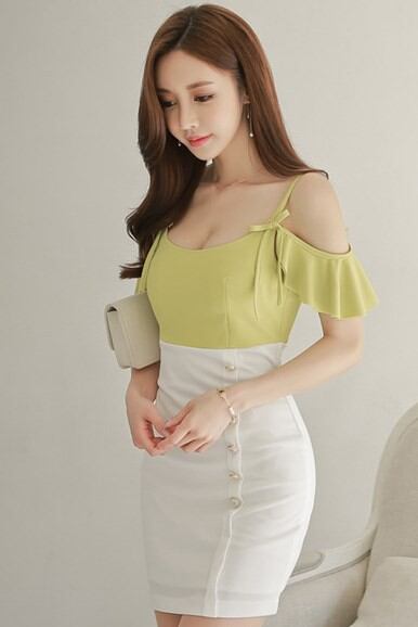 バイカラータイトワンピース ミニ丈 黄色×白 [A00172]