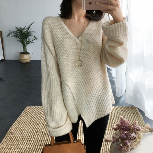ゆるニット トップス レディース ニット セーター Vネック 長袖 ロング袖 ざっくりニット アプリコット 黒 全2色 冬 新作 [A00174]