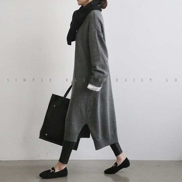 ニット ロング ワンピース レディース ニットワンピ ロングワンピ Vネック 長袖 ゆったり グレー 黒 全2色 秋 冬 新作 [A00197]