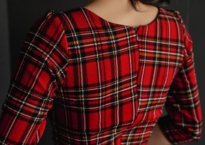 パーティにぴったりタイトワンピース 赤チェックが大人可愛い ペンシルスカートタイプ ラウンドネック 七分袖 ミニ丈 黒 赤 [A00222]