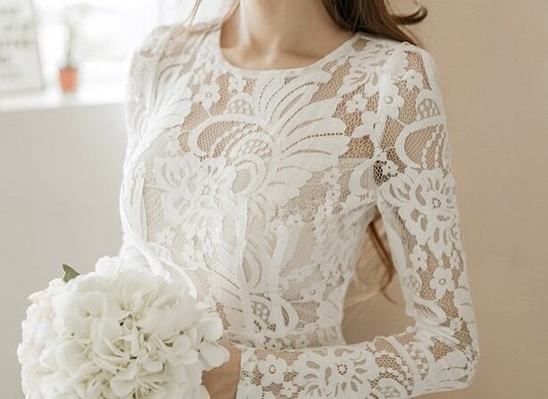 総レース長袖タイトワンピース ミモレ丈 ホワイト [A00227]