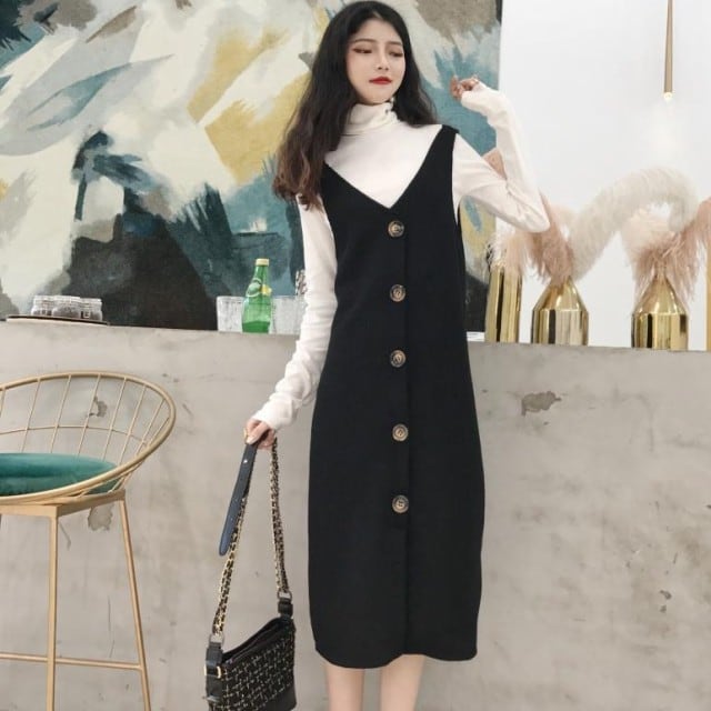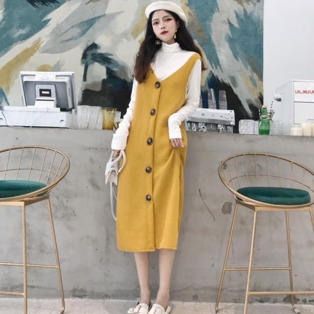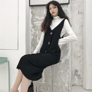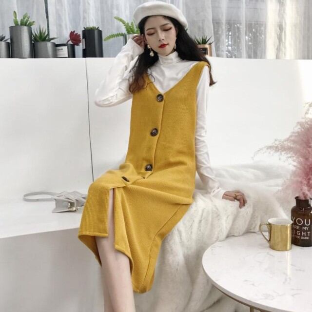 ニットソー ワンピース レディース ニット ロングワンピース 重ね着 ベスト イエロー 黒 アプリコット 全3色 秋 冬 新作 [A00232]