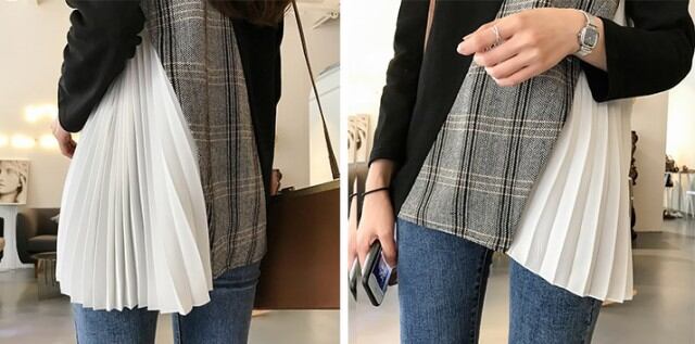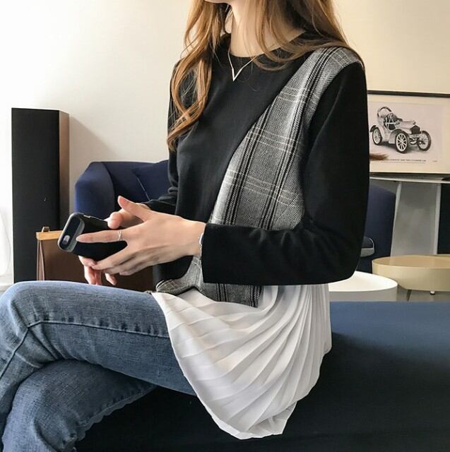 切り替えトップス レディース トップス チェック柄 プリーツ チュニック プルオーバー 黒 グレー 全2色 秋 冬 新作 [A00242]