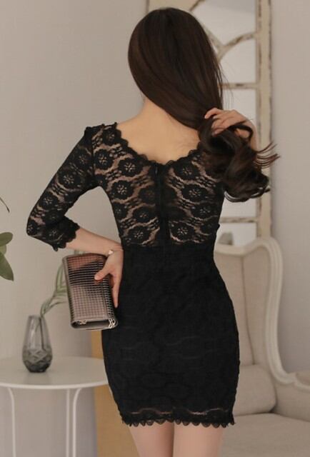 総レース七分袖タイトワンピース ミニ丈 黒 [A00249]