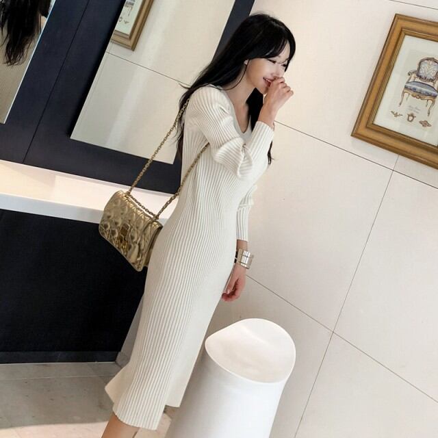 ニットワンピース ホワイトベージュ 長袖 ミモレ丈 リブニット Vネック レディース ワンピース 秋冬 [A00270]