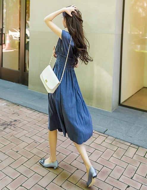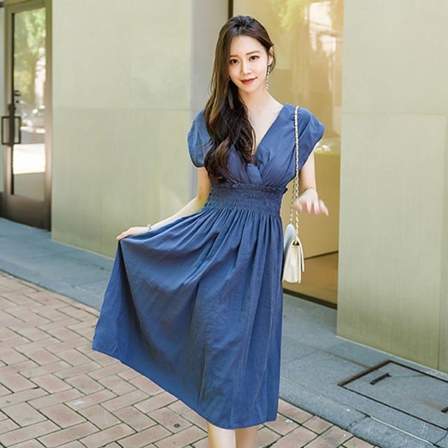 ワンピース Vネック 半袖 サマードレス リゾートドレス ブルー 青 無地 セクシー ミディアム 夏 [A00358]