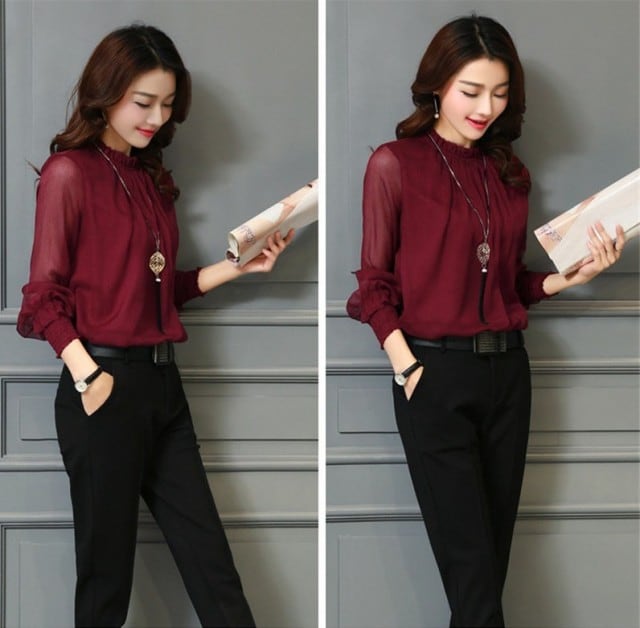 トップス レディース シフォン ブラウス 長袖 シースルー 大きいサイズあり 緑 ワインレッド ネイビー 白 黒 全5色 秋 新作 [A00384]