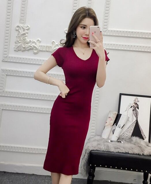 【即納あり】ワンピース レディース ニット Vネック 半袖 タイト バッククロス スリット 膝下丈 セクシー 赤 黒 グレー 全3色 [A00397]