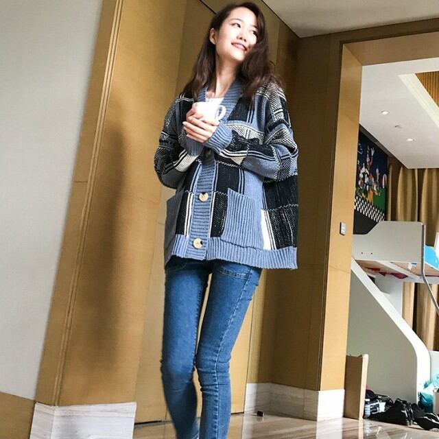 チェック柄 ニット カーディガン レディース コーディガン ショート丈 トップス チェック ブルーグレー アプリコット 全2色 秋 [A00411]