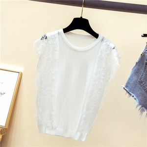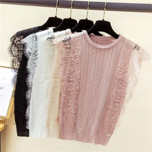 トップス レディース サマーニット 綿ニット ノースリーブ レース 可愛い 大人ガーリー 上品 ピンク アプリコット 白 黒 全4色 [A00425]