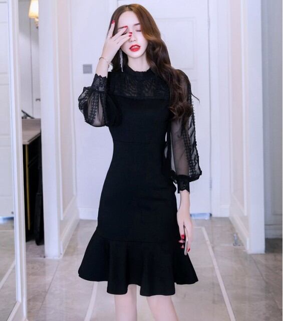 袖シースルー ワンピース レディース タイトワンピース 長袖 フリル 膝丈 マーメイドライン お呼ばれ パーティー 黒 冬 新作 [A00458]