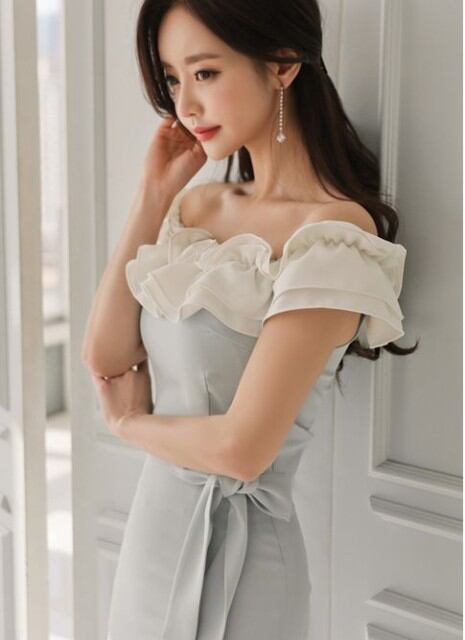 オフショルダーワンピース 膝下丈 タイト ペンシルスカート セクシー きれいめ パーティー お呼ばれ ドレス グレー [A00464]