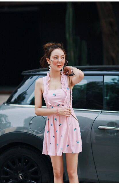 ワンピース水着 フリル バッククロス フレアスカート 小花柄 体型カバー ママ セクシー ピンク ナイトプール 夏 [A00497]