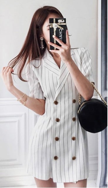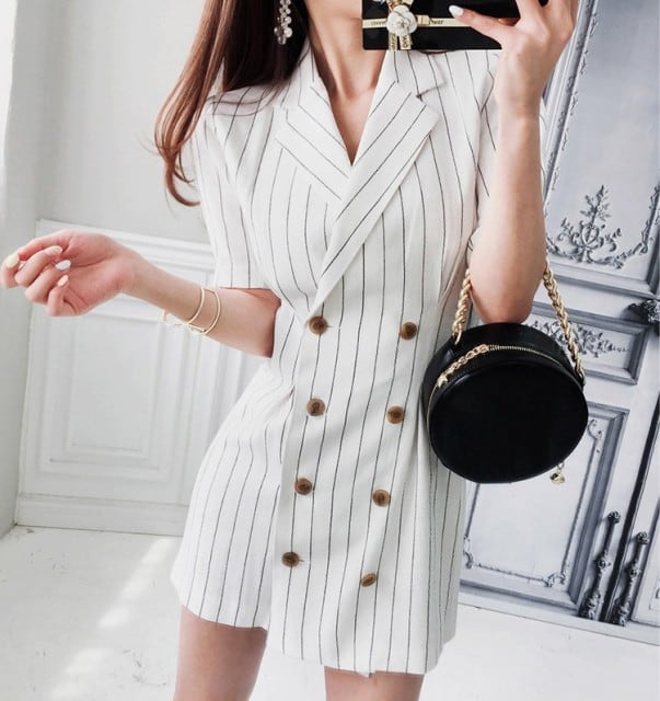 ジャケット風ワンピース ダブルボタン 半袖 ひざ上 ミニ丈 タイト 上品 かっちりきれいめ お呼ばれ 夏 スーツ風 ストライプ 白 [A00502]