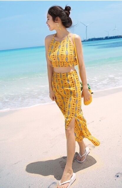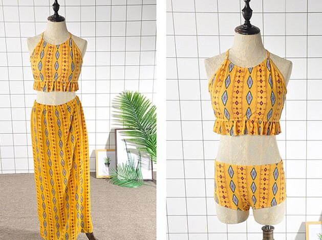 水着 レディース ビキニ ロングスカート付き 3点セット フリル ボクサー 黄 体型カバー ママ セクシー ナイトプール 夏 [A00503]