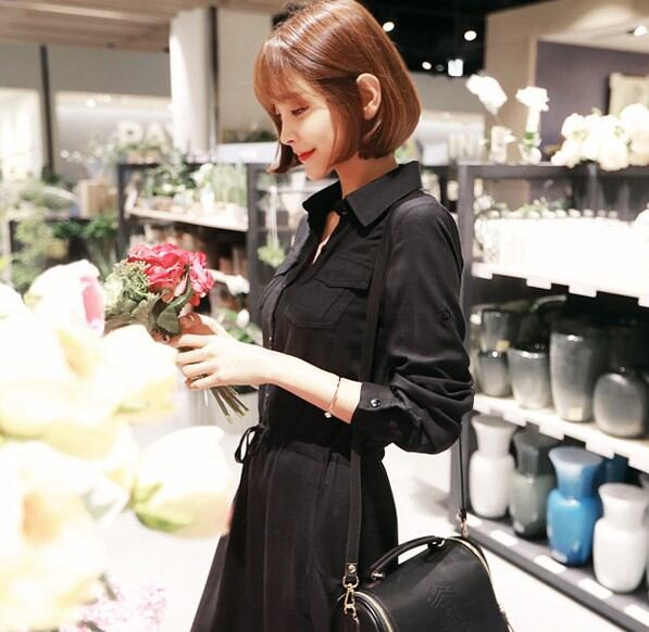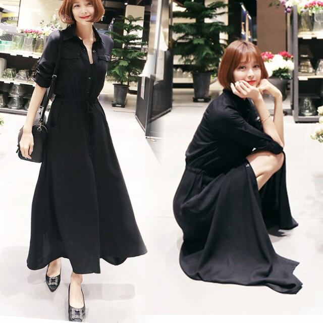 シャツワンピース レディース 長袖 ロールアップ ロング丈 マキシ丈 フレア コットン 無地 大人可愛い ブラック ブルー 全2色 [A00509]