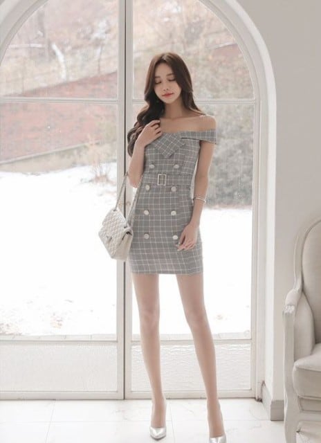 オフショルダー ワンピース 着こなし コーデ ブラウス ミニ セクシー きれいめ パーティー お呼ばれ 白 グレー格子 [A00525]