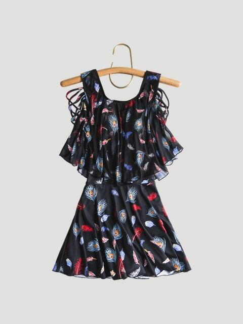 ワンピース水着 フレアスカート 肩開き フリル ボクサー 体型カバー ママ 大人可愛い セクシー 黒 ナイトプール 夏 [A00527]