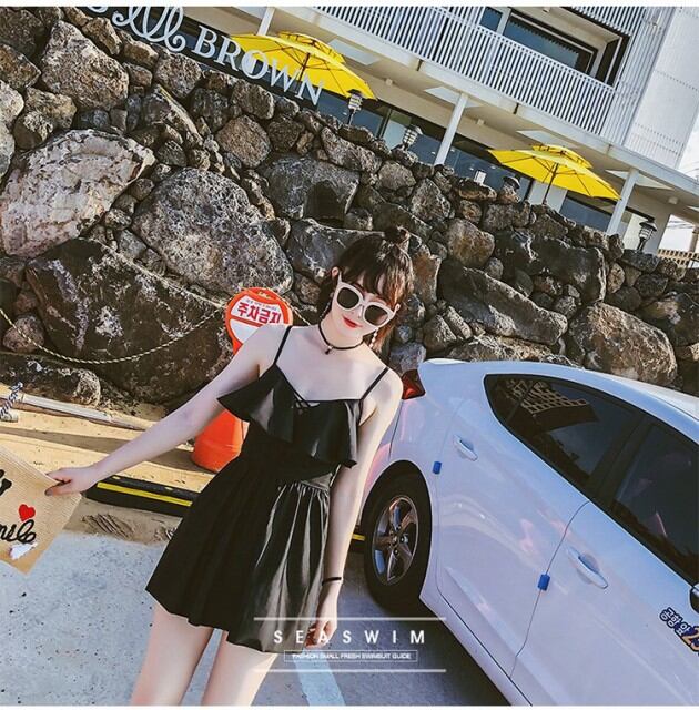 ワンピース水着 レディース フレア ワイヤー ボクサー 体型カバー ママ バックレースアップ 大人ガーリー 黒 ナイトプール2019 夏 [A00567]