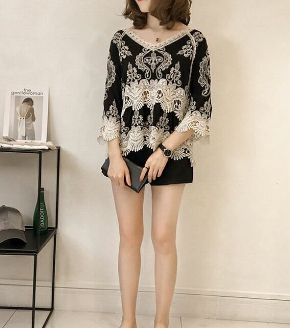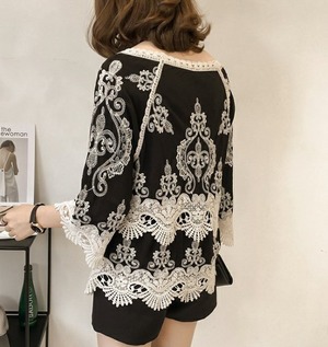 トップス レディース ブラウス 刺繍 レース 七分袖 フレアスリーブ 大きいサイズあり オシャレ 大人可愛い ガーリー 黒 秋 新作 [A00569]