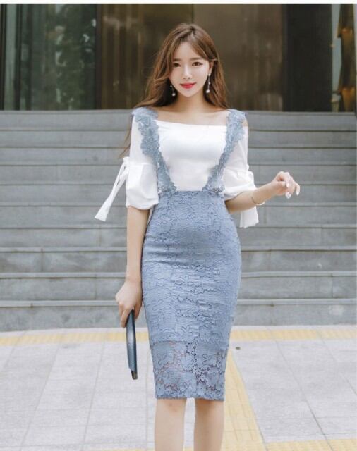 ツーピース スーツ レディース カジュアル セットアップ おしゃれ セクシー ロングレース シャツ スカート 袖コンシャス 白 水色 [A00574]