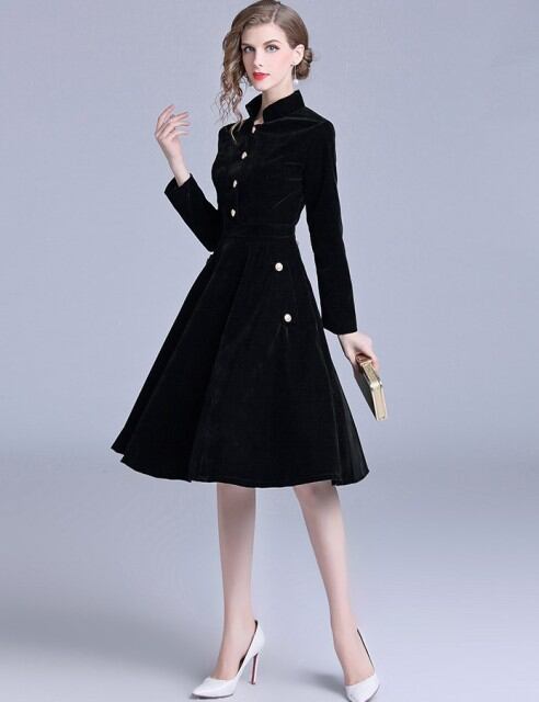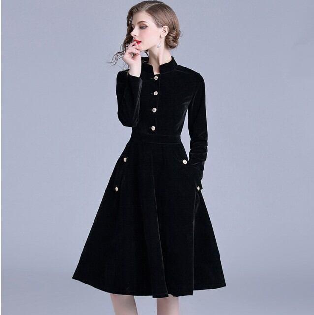 ベルベット スタンドカラー ワンピース レディース 長袖 フレアスカート 膝丈 ゴールドボタン お呼ばれ パーティー 黒 冬 新作 [A00582]
