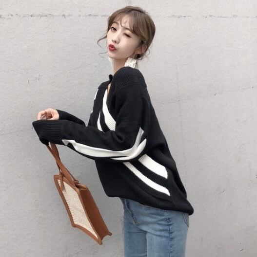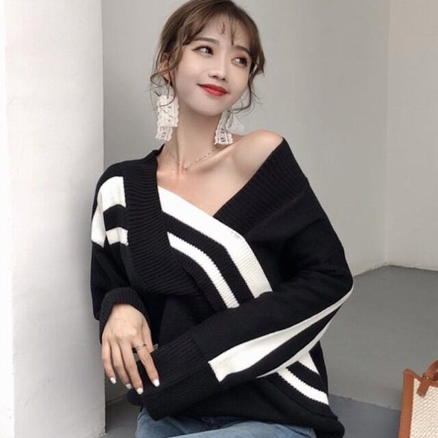 ゆるニット クロスデザイン トップス レディース ニット セーター Vネック 長袖 ざっくりニット 黒 白 全2色 冬 新作 [A00619]