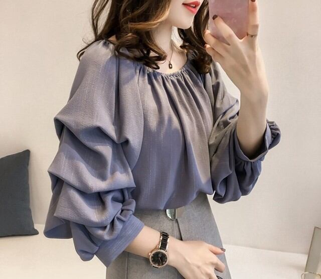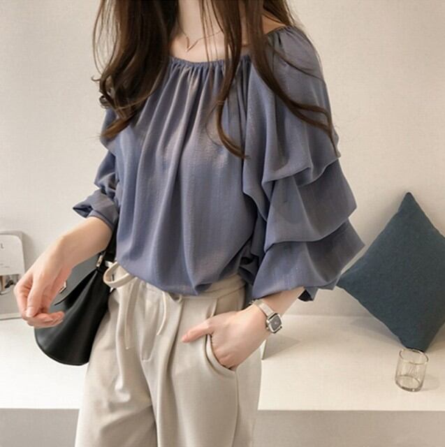トップス レディース シフォン ブラウス オフショル 七分袖 フリル 大きいサイズあり ブルー ピンク アプリコット 全3色 秋 新作 [A00647]