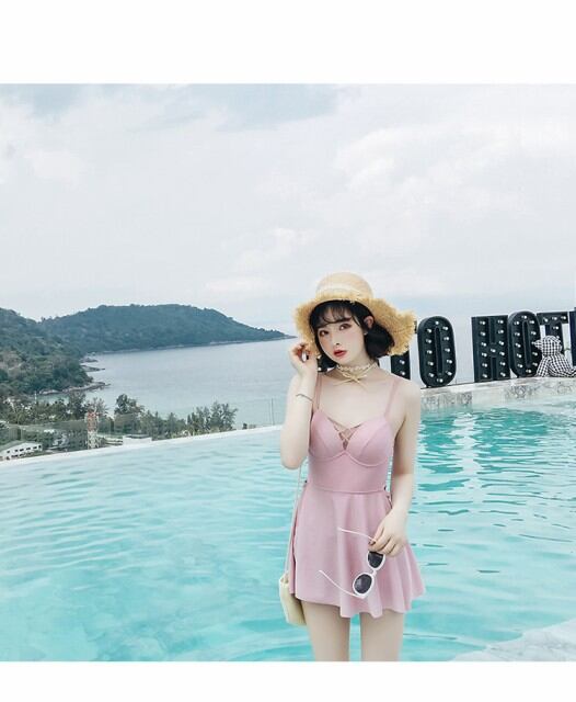 ワンピース水着 フレアスカート フロントレースアップ バッククロス ボクサー 体型カバー ママ ピンク ナイトプール 夏 [A00683]