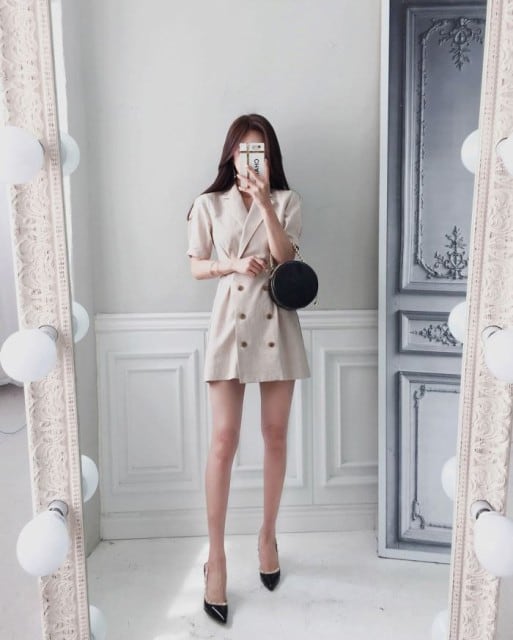 ジャケット風ワンピース ダブルボタン 半袖 ひざ上 ミニ丈 タイト 上品 かっちりきれいめ お呼ばれ 夏 スーツ風 アプリコット [A00708]