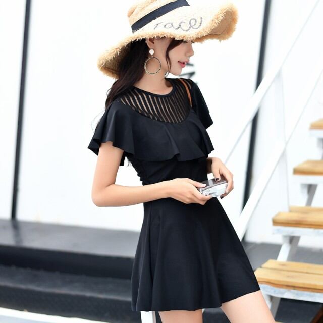 ワンピース水着 レディース フリル 透け感 セクシー ブラック 黒 体型カバー ママ ボクサータイプ ナイトプール インスタ [A00722]