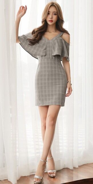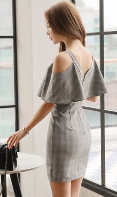オープンショルダーフリル袖タイトワンピース ミニ丈 グレーチェック [A00771]