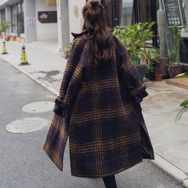 チェック柄 ロングコート レディース アウター チェスターコート ロング丈 チェック オシャレ イエロー×パープル 冬 新作 [A00780]