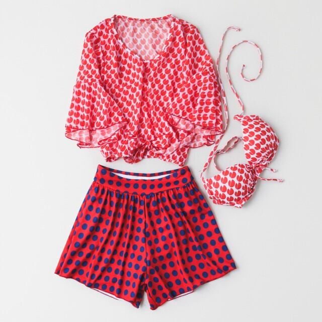 水着 ビキニ タンキニ 3点セット ショートパンツ 体型カバー ママ ドット柄 赤 セクシー リゾート ナイトプール インスタ [A00790]