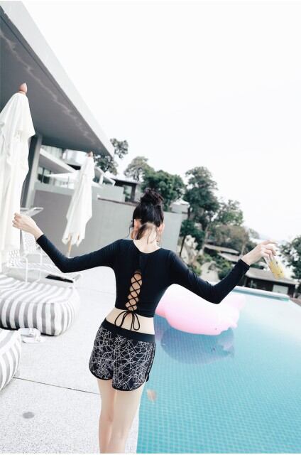 水着 レディース ビキニ タンキニ セパレート 長袖 体型カバー ママ バックレースアップ スポーティー 黒 ナイトプール 夏 [A00800]