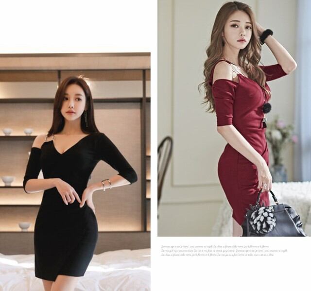 ワンショルダー七分袖ラップスカート風タイトワンピース ミニ丈 ブラック ワインレッド [A00815]