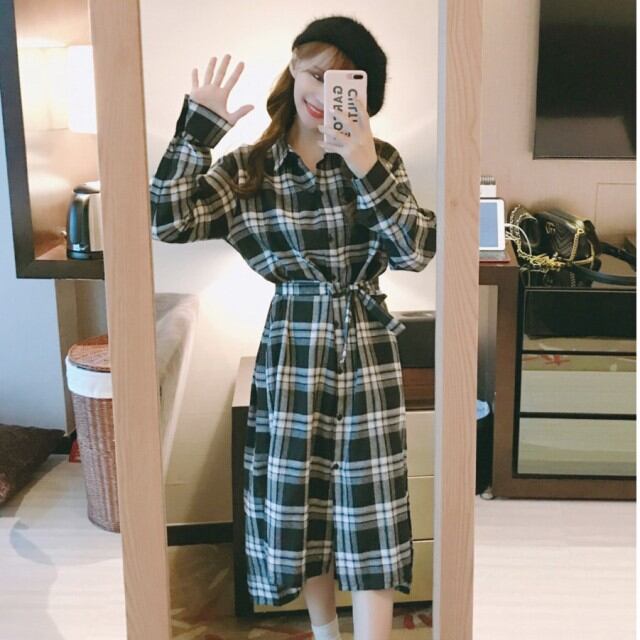 チェック柄 ワンピース レディース シャツワンピース ロング 膝下丈 長袖 チェック ウエストリボン スリット 黒 秋 新作 [A00823]
