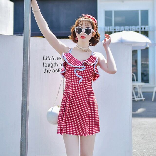 ワンピース水着 レディース フリル チェック柄 体型カバー ママ ボクサー 大人ガーリー 赤 ナイトプール 夏 [A00833]