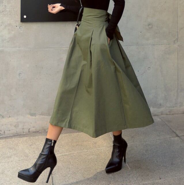 ロングスカート バックウエストリボン レディース スカート ロング丈 バックリボン ポケットあり アーミーグリーン 秋 新作 [A00837]