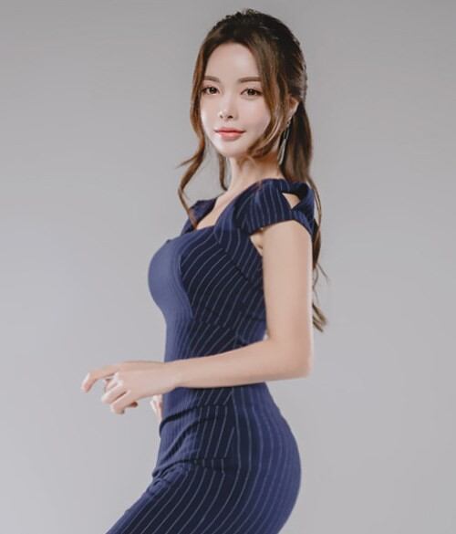 パフスリーブストライプタイトワンピース ミニ丈 ネイビー [A00856]