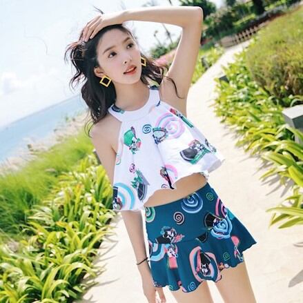 水着 ツーピース ホルターネック 総柄 大人可愛い フレアスカート 体型カバー 白 グリーン 背中見せ ボクサータイプ [A00863]